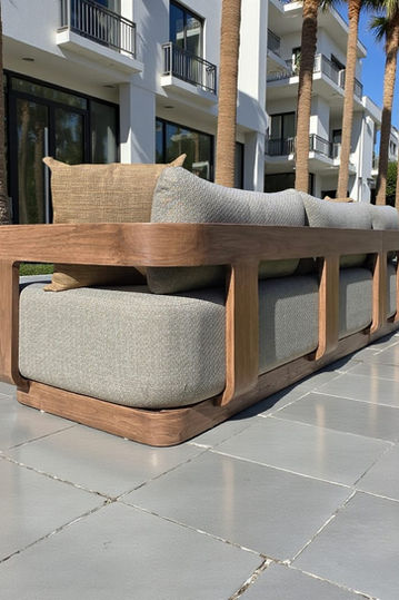 a sculptural statement in relaxed luxury. Designed with a graceful, rounded form, this expansive 103" x 103" sectional invites conversation and calm. The frame is crafted from solid teak in a weathered finish that softens the silhouette with organic warmth and timeless character. Cushions are tailored in a textured linen weave, blending cool grey tones with subtle beige undertones for a refined, coastal palette.
